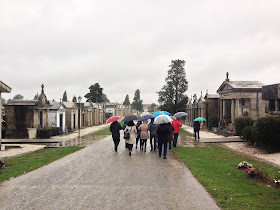 Aló nos reunimos unhas 20 persoas que escoitamos as explicacións de Carmela, que nos fixo un repaso histórico polos cemiterios da cidade: A clausura do da Quintana, coas queixas das monxas de San Paio de Antealtares; a inauguración de Bonaval no ano 1847, pero con bastante descontento, a proxección de finais do século XIX para a zona da Cova do Raposo e finalmente a apertura de Boisaca, que compartiu función con Bonaval ata o ano 1973.